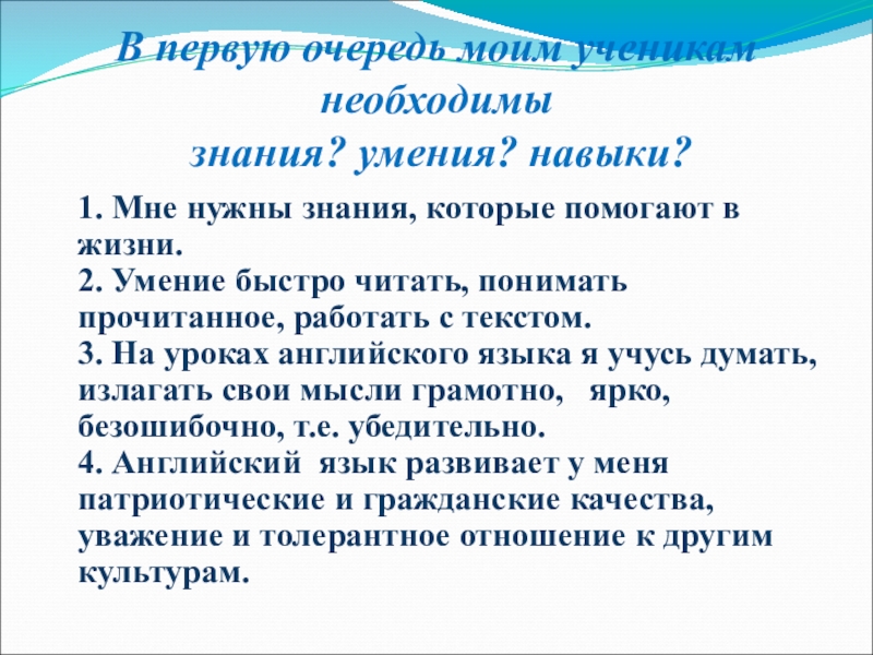 3. На уроках английского языка я учусь думать, излагать свои мысли грамотно, ярко, безошибочно, т.е. убедительно.