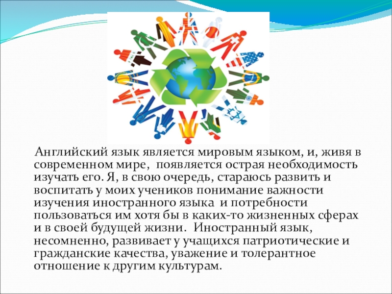 мире, появляется острая необходимость изучать его. Я, в свою очередь, стараюсь развить и воспитать у моих учеников понимание важности изучения иностранного языка и потребности пользоваться им хотя бы в каких-то жизненных сферах и в своей будущей жизни. Иностранный язык, несомненно, развивает у учащихся патриотические и гражданские качества, уважение и толерантное отношение к другим культурам.