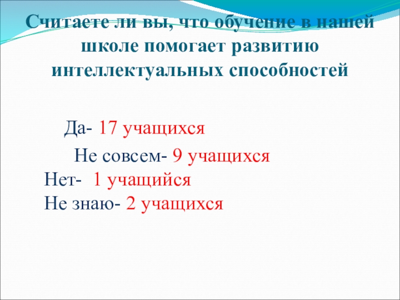 Слайд 17Считаете ли вы, что обучение в нашей школе помогает развитию интеллектуальных