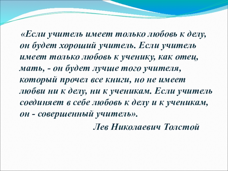 Слайд 2 «Если учитель имеет только любовь к делу, он будет