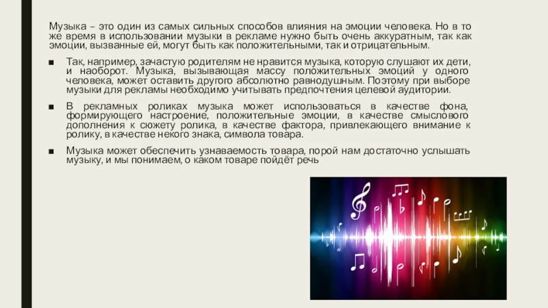 человека. Но в то же время в использовании музыки в рекламе нужно быть очень аккуратным, так как эмоции, вызванные ей, могут быть как положительными, так и отрицательным.