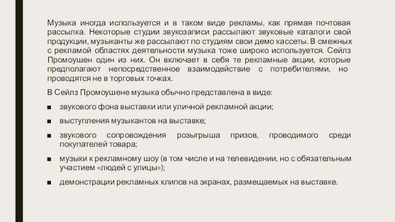 рассылка. Некоторые студии звукозаписи рассылают звуковые каталоги свой продукции, музыканты же рассылают по студиям свои демо кассеты. В смежных с рекламой областях деятельности музыка тоже широко используется. Сейлз Промоушен один из них. Он включает в себя те рекламные акции, которые предполагают непосредственное взаимодействие с потребителями, но проводятся не в торговых точках.