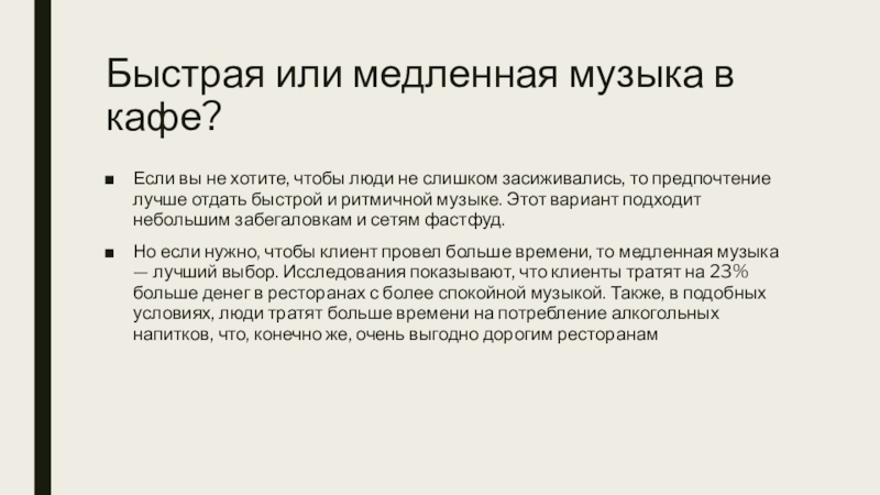 Но если нужно, чтобы клиент провел больше времени, то медленная музыка — лучший выбор. Исследования показывают, что клиенты тратят на 23% больше денег в ресторанах с более спокойной музыкой. Также, в подобных условиях, люди тратят больше времени на потребление алкогольных напитков, что, конечно же, очень выгодно дорогим ресторанам
