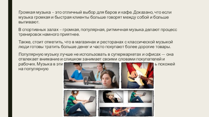 Слайд 10Громкая музыка – это отличный выбор для баров и кафе. Доказано,