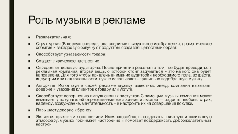 В рекламных роликах музыка может использоваться в качестве фона, формирующего настроение, положительные эмоции, в качестве смыслового дополнения к сюжету ролика, в качестве фактора, привлекающего внимание к ролику, в качестве некого знака, символа товара.