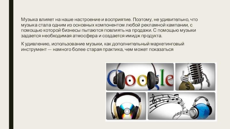 Слайд 2Музыка влияет на наше настроение и восприятие. Поэтому, не удивительно, что