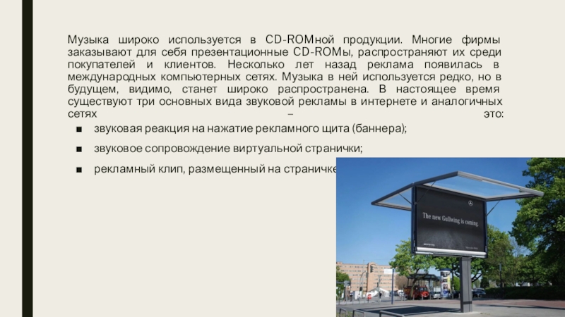 презентационные CD-ROMы, распространяют их среди покупателей и клиентов. Несколько лет назад реклама появилась в международных компьютерных сетях. Музыка в ней используется редко, но в будущем, видимо, станет широко распространена. В настоящее время существуют три основных вида звуковой рекламы в интернете и аналогичных сетях – это: