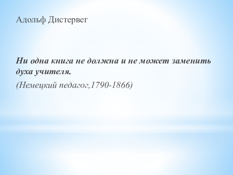 Адольф ДистервегНи одна книга не должна и не может заменить духа учителя.(Немецкий педагог,1790-1866)