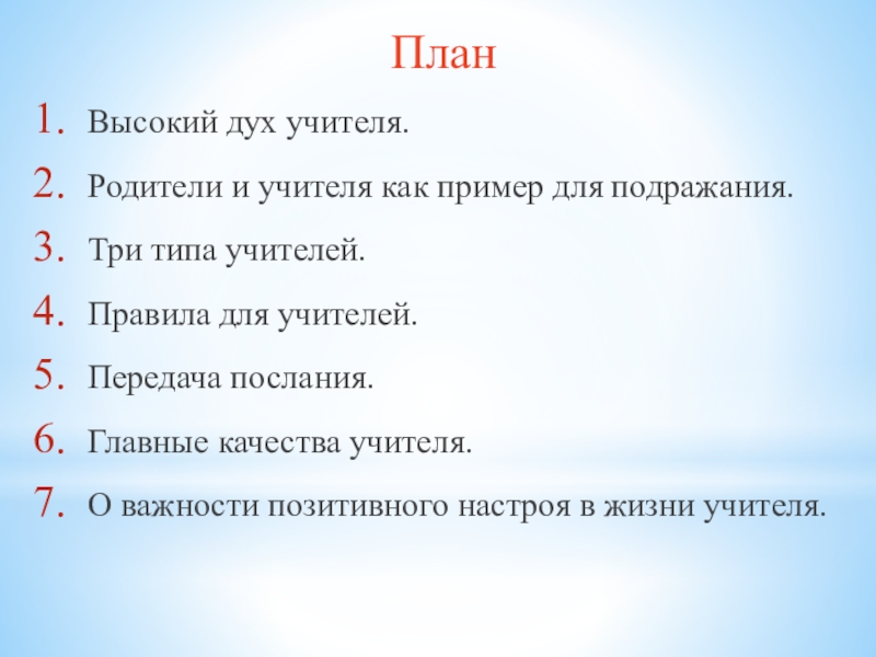 ПланВысокий дух учителя.Родители и учителя как пример для подражания.Три типа учителей.Правила для учителей.Передача послания.Главные качества учителя.О важности позитивного настроя в жизни учителя.