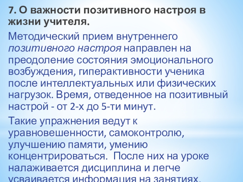 7. О важности позитивного настроя в жизни учителя.Методический прием внутреннего позитивного настроя направлен на преодоление состояния эмоционального