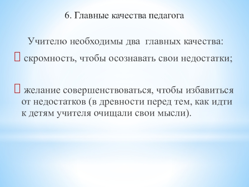 6. Главные качества педагога	Учителю необходимы два главных качества: скромность, чтобы осознавать свои недостатки; желание совершенствоваться, чтобы избавиться