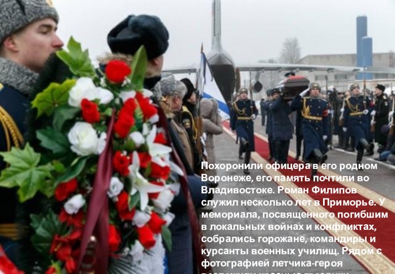 Роман Филипов служил несколько лет в Приморье. У мемориала, посвященного погибшим в локальных войнах и конфликтах, собрались горожане, командиры и курсанты военных училищ. Рядом с фотографией летчика-героя возложили красные гвоздики.