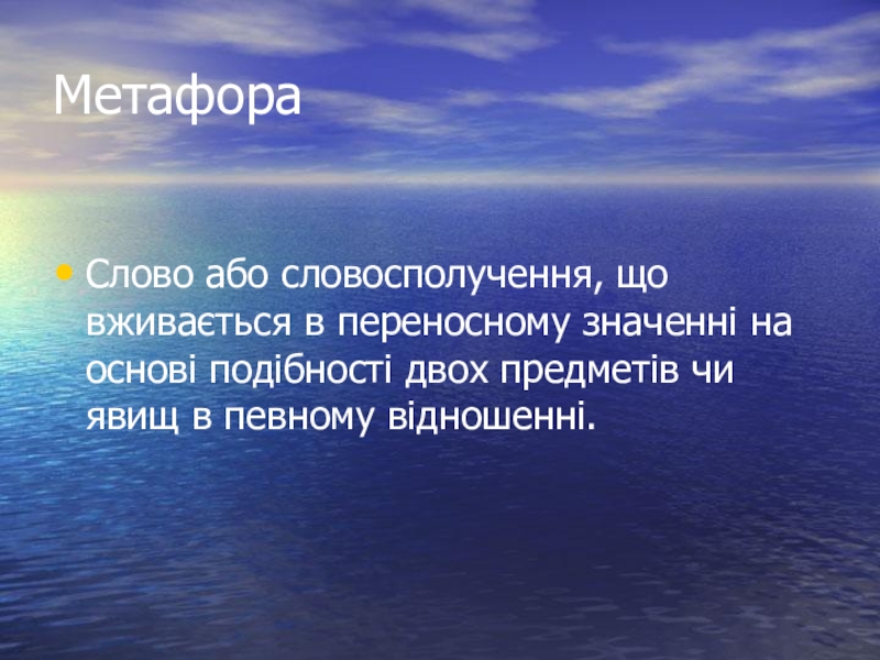МетафораСлово або словосполучення, що вживається в переносному значенні на основі подібності двох предметів чи явищ в певному
