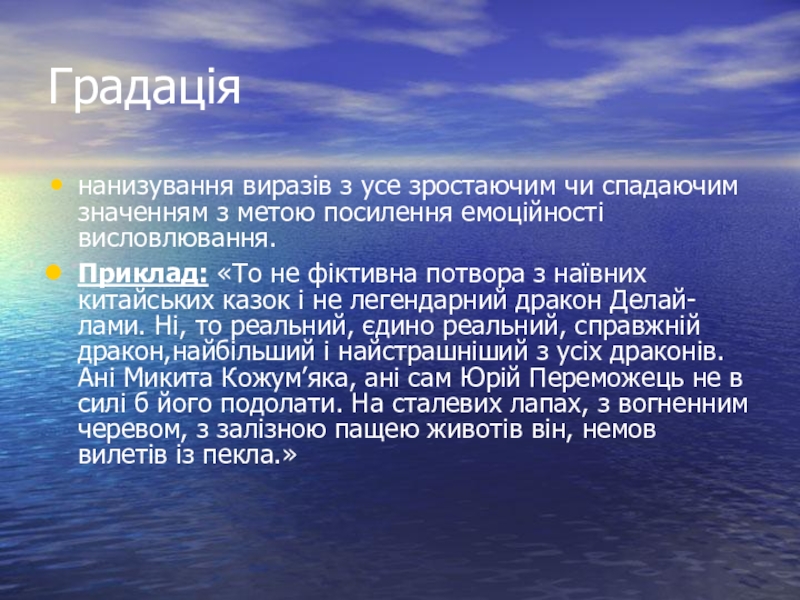 Градацiянанизування виразiв з усе зростаючим чи спадаючим значенням з метою посилення емоцiйностi висловлювання.Приклад: «То не фiктивна потвора