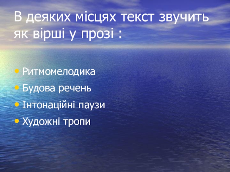 В деяких місцях текст звучить як вірші у прозі :РитмомелодикаБудова реченьІнтонаційні паузиХудожні тропи