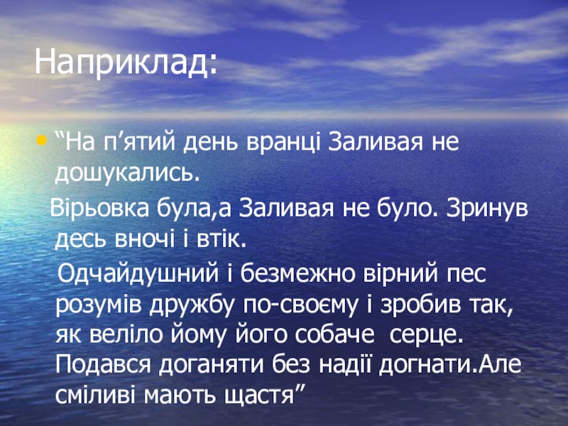 Наприклад:“На п’ятий день вранці Заливая не дошукались. Вірьовка була,а Заливая не було. Зринув десь вночі і втік.