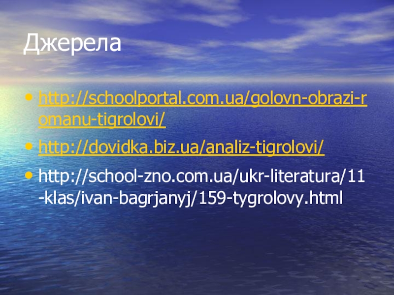 Джерелаhttp://schoolportal.com.ua/golovn-obrazi-romanu-tigrolovi/http://dovidka.biz.ua/analiz-tigrolovi/http://school-zno.com.ua/ukr-literatura/11-klas/ivan-bagrjanyj/159-tygrolovy.html