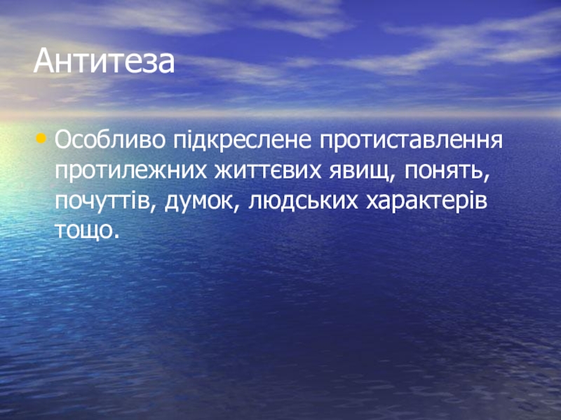 АнтитезаОсобливо пiдкреслене протиставлення протилежних життєвих явищ, понять, почуттів, думок, людських характерів тощо.