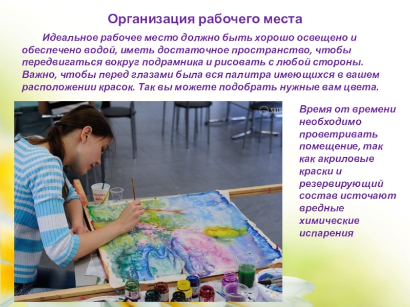 Время от времени необходимо проветривать помещение, так как акриловые краски и резервирующий состав источают вредные химические испарения