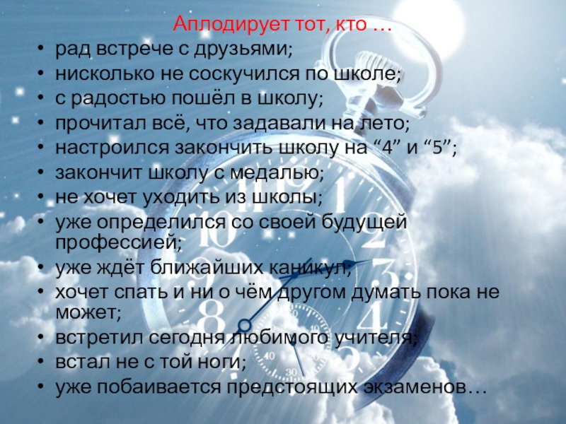 Аплодирует тот, кто …рад встрече с друзьями;нисколько не соскучился по школе;с радостью пошёл в школу;прочитал всё, что