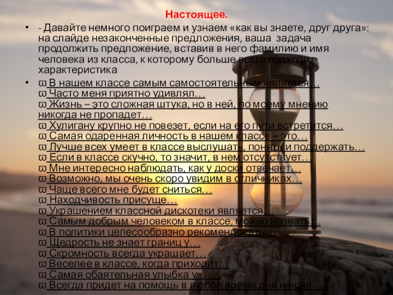 Настоящее.- Давайте немного поиграем и узнаем «как вы знаете, друг друга»: на слайде незаконченные предложения, ваша  задача