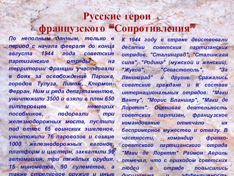 К 1944 году в стране действовали десятки советских партизанских отрядов: "Сталинград", "Сталинская сила", "Родина" (мужской и женский), "Жуков", "Севастополь", "За Ленинград" и другие. Сражались советские граждане и в составе интернациональных отрядов: "Маки Ванту", "Морис Бланшар", "Маки де Лоретт". Оценивая деятельность советских партизан, французское командование отмечало их беспримерное мужество и отвагу. В частности, командир франко-советского партизанского отряда "Маки де Лоретт" Раймон Авриль отмечал, что с приходом советских людей в отряде повысились дисциплина и эффективность боевых действий.