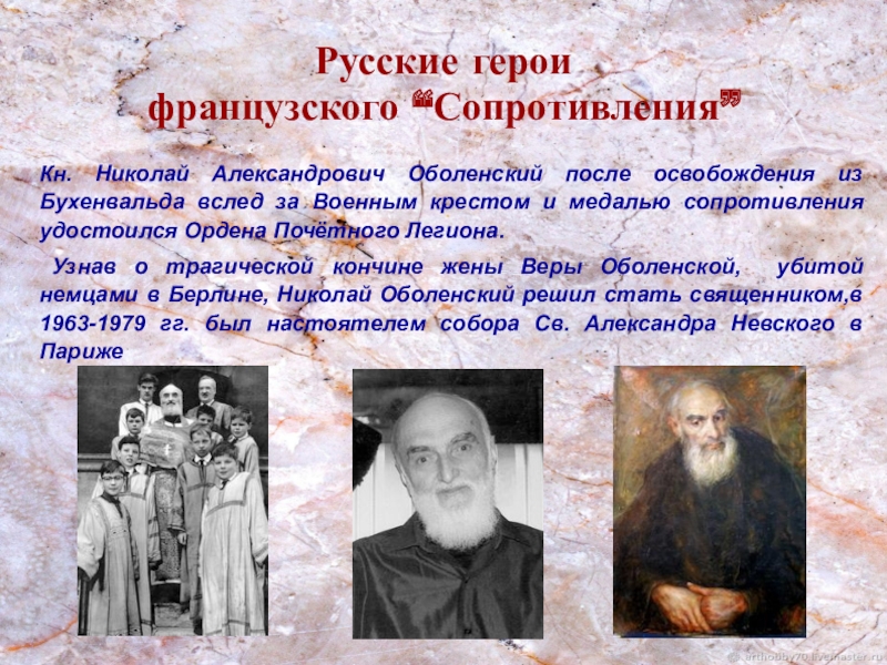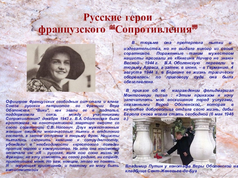 В тюрьме она претерпела пытки и издевательства, но не выдала никого из своих соратников. Пораженные таким мужеством нацисты прозвали ее «Княгиня Ничего не знаю» Весной 1944 г. В.А. Оболенскую перевели в тюрьму Арраса, а затем, в июне, – в Германию. 4 августа 1944 г. в Берлине ее жизнь трагически оборвалась: по приговору суда она была обезглавлена.