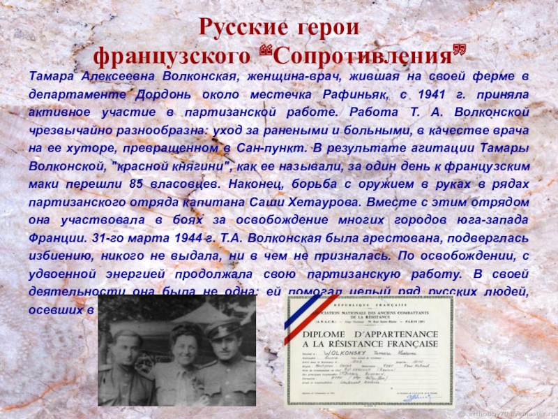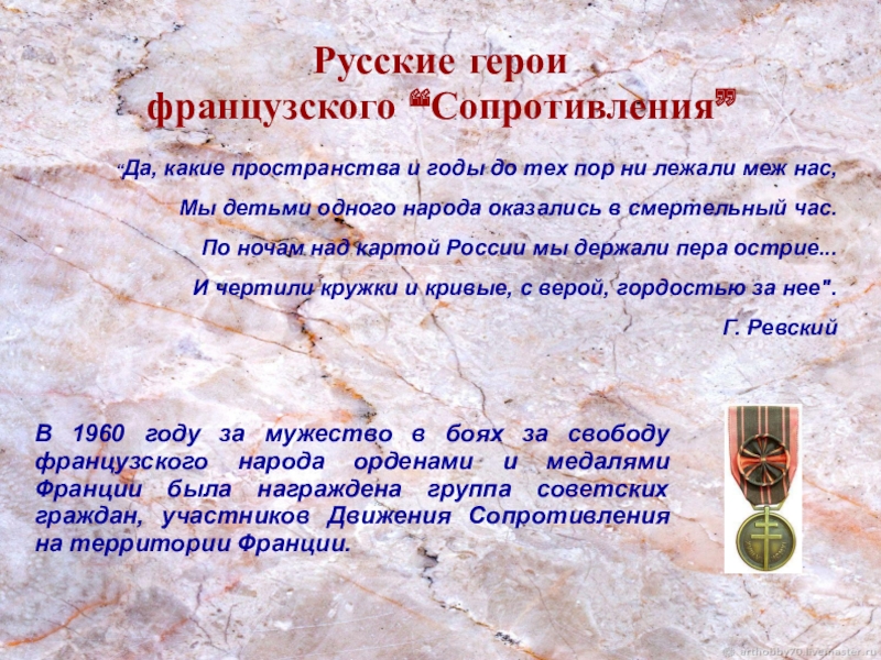 В 1960 году за мужество в боях за свободу французского народа орденами и медалями Франции была награждена группа советских граждан, участников Движения Сопротивления на территории Франции.