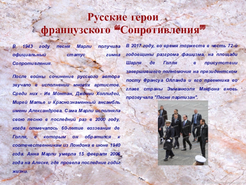 В 2017 году, во время торжеств в честь 72-й годовщины разгрома фашизма, на площади Шарля де Голля в присутствии завершившего полномочия на президентском посту Франсуа Олланда и его преемника во главе страны Эмманюэля Макрона вновь прозвучала "Песня партизан".