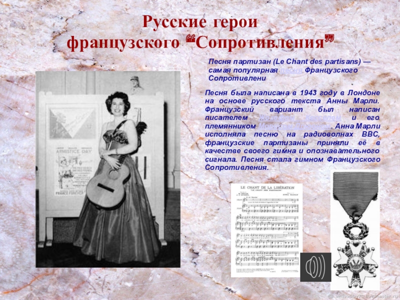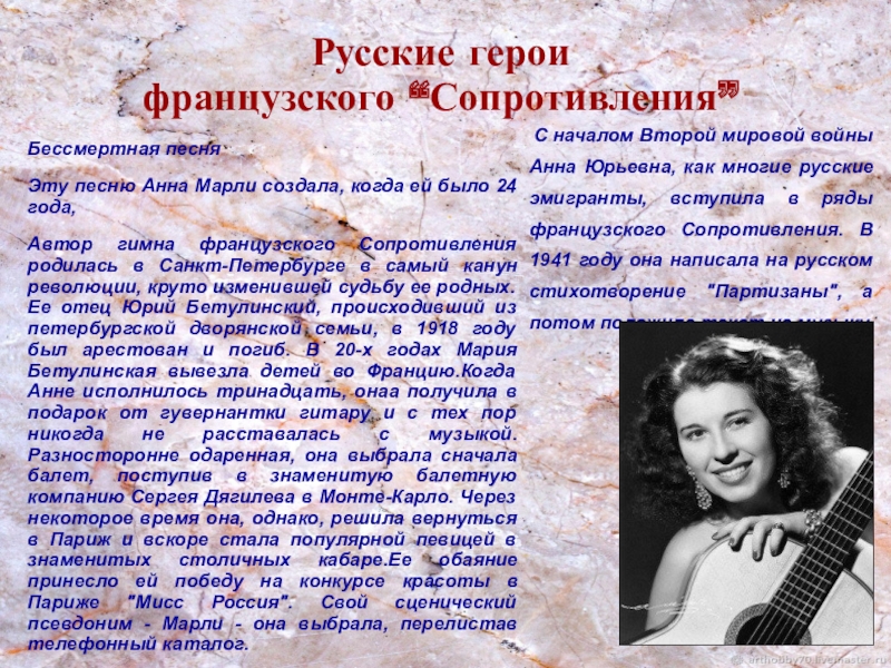 С началом Второй мировой войны Анна Юрьевна, как многие русские эмигранты, вступила в ряды французского Сопротивления. В 1941 году она написала на русском стихотворение "Партизаны", а потом положила текст на музыку.