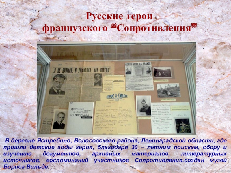 Б.В. Вильде – национальный герой Франции, посмертно награжден медалью французского сопротивления. Его именем названа одна из улиц Парижа. В этнографическом музее, где он работал, находится мемориальная доска с надписью Шарля де Голля.