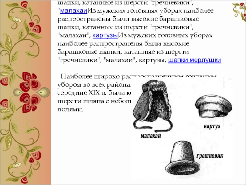 из шерсти "гречневики", "малахаиИз мужских головных уборах наиболее распространены были высокие барашковые шапки, катанные из шерсти "гречневики", "малахаи", картузыИз мужских головных уборах наиболее распространены были высокие барашковые шапки, катанные из шерсти "гречневики", "малахаи", картузы, шапки мерлушки .