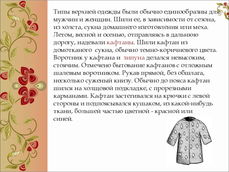 Слайд 4Типы верхней одежды были обычно единообразны для мужчин и женщин. Шили