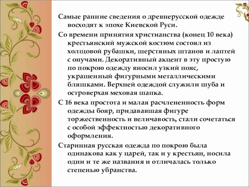 Слайд 2Самые ранние сведения о древнерусской одежде восходят к эпохе Киевской Руси.