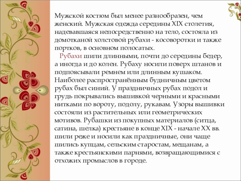 Рубахи шили длинными, почти до середины бедер, а иногда и до колен. Рубаху носили поверх штанов и подпоясывали ремнем или длинным кушаком.