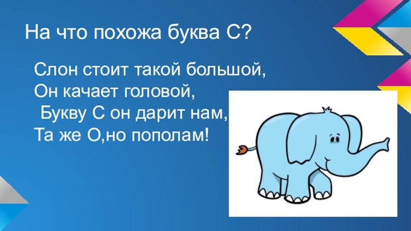 На что похожа буква С?Слон стоит такой большой,Он качает головой, Букву С он дарит нам,Та же О,но
