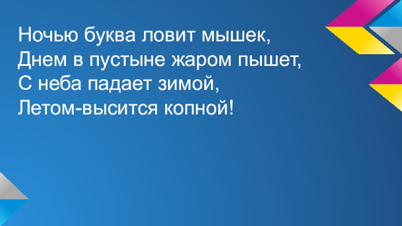 Ночью буква ловит мышек,Днем в пустыне жаром пышет,С неба падает зимой,Летом-высится копной!