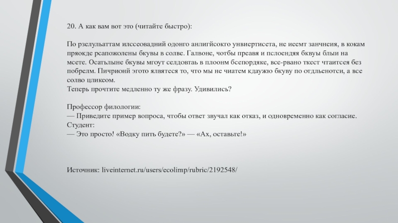 анлигйсокго унвиертисета, не иеемт занчнеия, в кокам пряокде рсапожолены бкувы в солве. Галвоне, чотбы преавя и пслоендяя бквуы блыи на мсете. Осатьлыне бкувы мгоут селдовтаь в плоонм бсепордяке, все-рвано ткест чтаитсея без побрелм. Пичрионй эгото ялвятеся то, что мы не чиатем кдаужю бкуву по отдльенотси, а все солво цликеом.