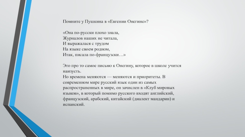 Но времена меняются — меняются и приоритеты. В современном мире русский язык один из самых распространенных в мире, он зачислен в «Клуб мировых языков», в который помимо русского входят английский, французский, арабский, китайский (диалект мандарин) и испанский.