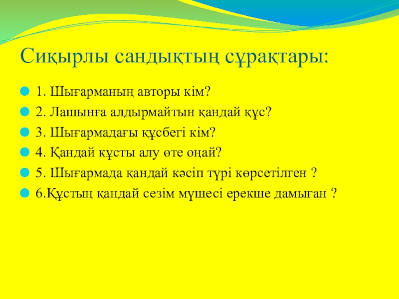 Слайд 18Сиқырлы сандықтың сұрақтары: