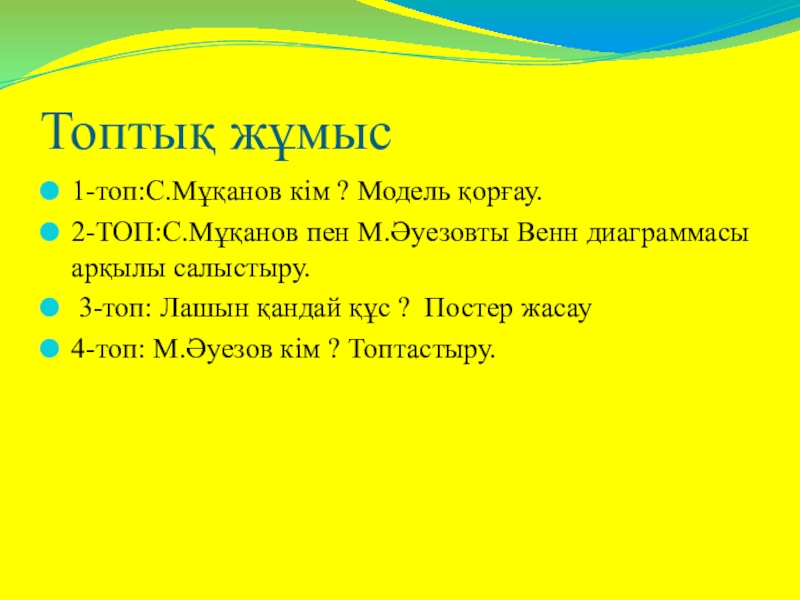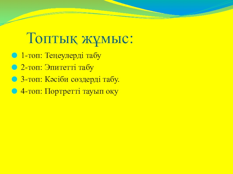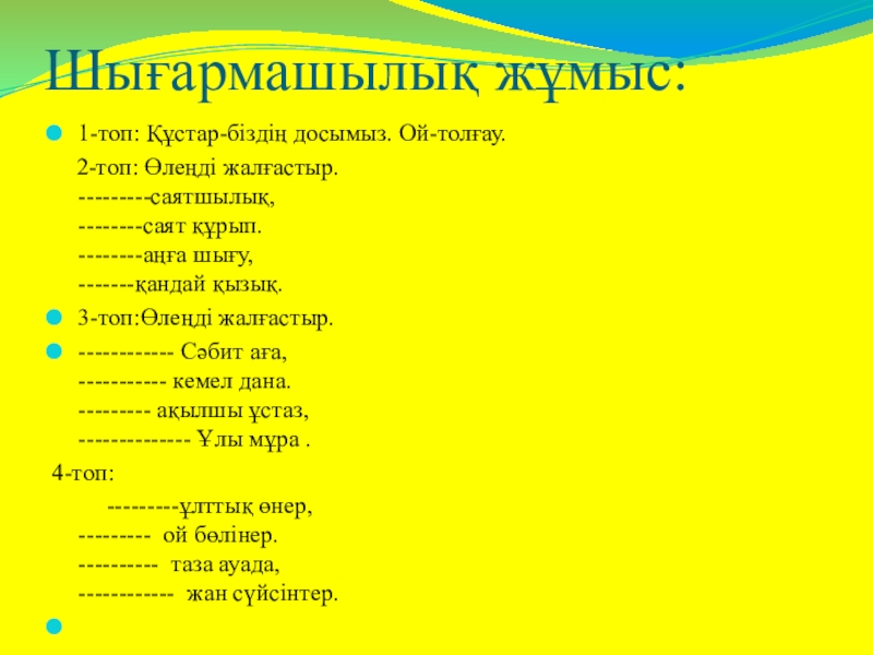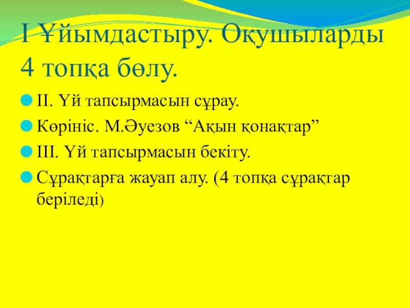 Слайд 1І Ұйымдастыру. Оқушыларды 4 топқа бөлу.