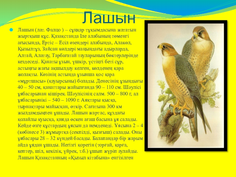 (лат. Фалцо ) – сұңқар тұқымдасына жататын жыртқыш құс. Қазақстанда Іле алабының төменгі ағысында, Ертіс – Есіл өзендері алабында, Алакөл, Қызылтұз, Зайсан көлдері маңындағы адырларда, Алтай, Алатау, Тарбағатай тауларының бөктерлерінде кездеседі. Қанаты ұзын, үшкір, үстіңгі беті сұр, астыңғы жағы ақшылдау келген, көлденең қара жолақты. Көзінің астында ұзынша қос қара «мұртшасы» (қауырсыны) болады. Денесінің ұзындығы 40 – 50 см, қанаттары жайылғанда 90 – 110 см. Шәулісі ұябасарынан кішірек. Шәулісінің салм. 500 – 800 г, ал ұябасарынікі – 540 – 1090 г. Аяқтары қысқа, тырнақтары майысқан, өткір. Сағатына 300 км жылдамдықпен ұшады. Лашын жартас, құздағы қолайлы қуысқа, қияда өскен ағаш басына ұя салады. Кейде өзге құстардың ұясын да иемденеді. Ұясына 2 – 4 (көбінесе 3) жұмыртқа (секпілді, қызғыш) салады. Оны ұябасары 28 – 32 күндей басады. Балапандар бір жарым айда ұядан ұшады. Негізгі қорегін (торғай, қарға, кептер, шіл, кекілік, үйрек, т.б.) ұшып жүріп аулайды. Лашын Қазақстанның «Қызыл кітабына» енгізілген