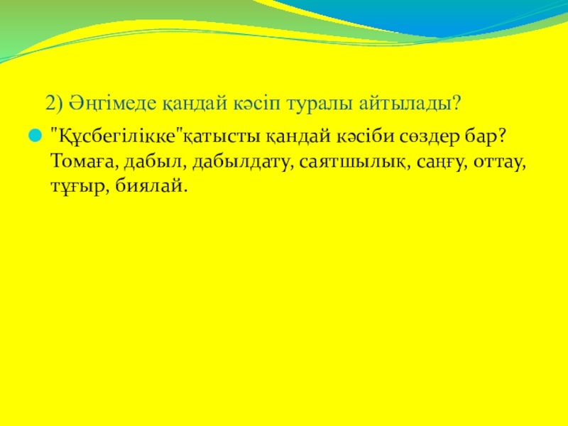Слайд 15 2) Әңгімеде қандай кәсіп туралы айтылады?