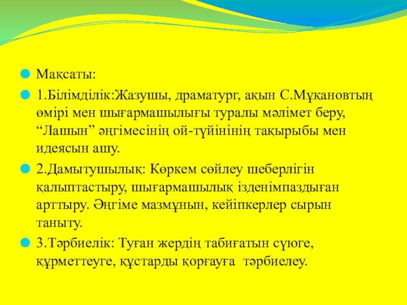 1.Білімділік:Жазушы, драматург, ақын С.Мұқановтың өмірі мен шығармашылығы туралы мәлімет беру, “Лашын”