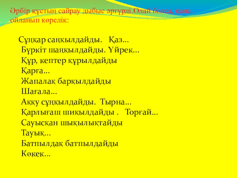 Әрбір құстың сайрау дыбыс әртүрлі.Олай болса, қане, ойланып көрелік: