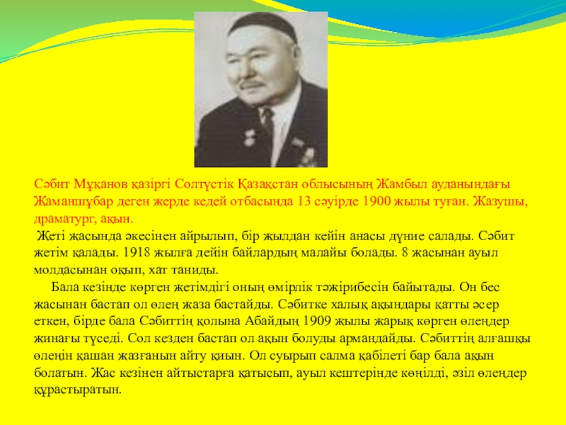 Слайд 4Сәбит Мұқанов қазіргі Солтүстік Қазақстан облысының Жамбыл ауданындағы Жаманшұбар деген жерде кедей отбасында