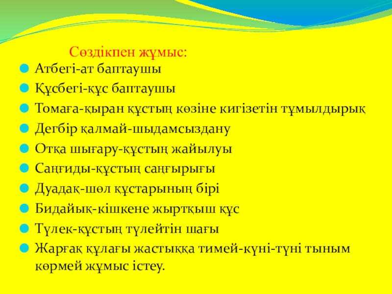 сөздер бар? Томаға, дабыл, дабылдату, саятшылық, саңғу, оттау, тұғыр, биялай.
