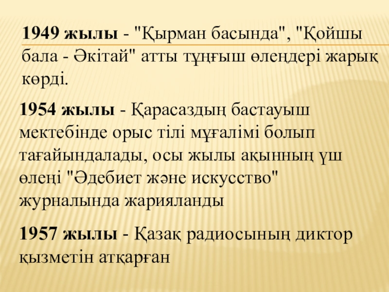 1954 жылы - Қарасаздың бастауыш мектебінде орыс тілі мұғалімі болып тағайындалады, осы жылы ақынның үш өлеңі "Әдебиет және искусство" журналында жарияланды