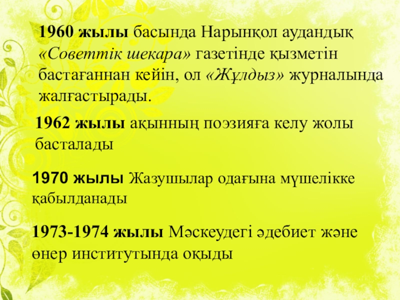 1962 жылы ақынның поэзияға келу жолы басталады