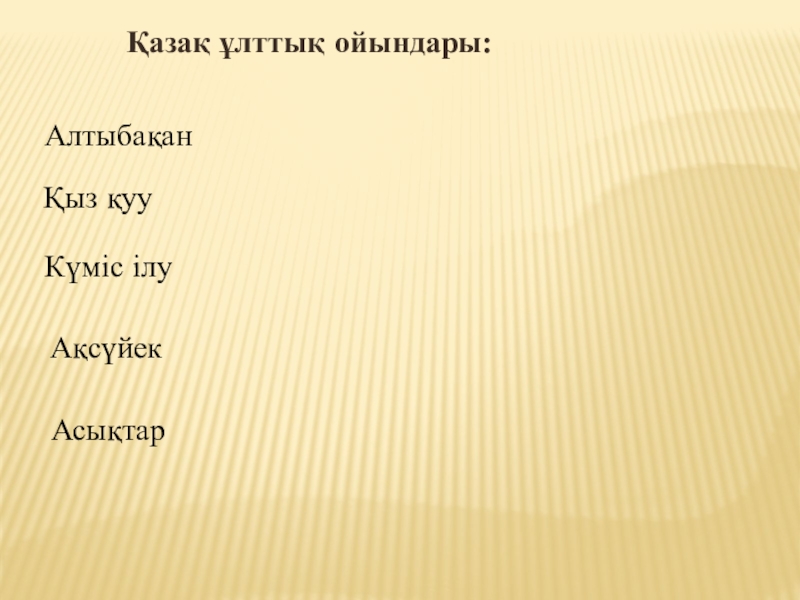 Қазақ ұлттық ойындары: Алтыбақан Қыз қууКүміс ілу Ақсүйек Асықтар